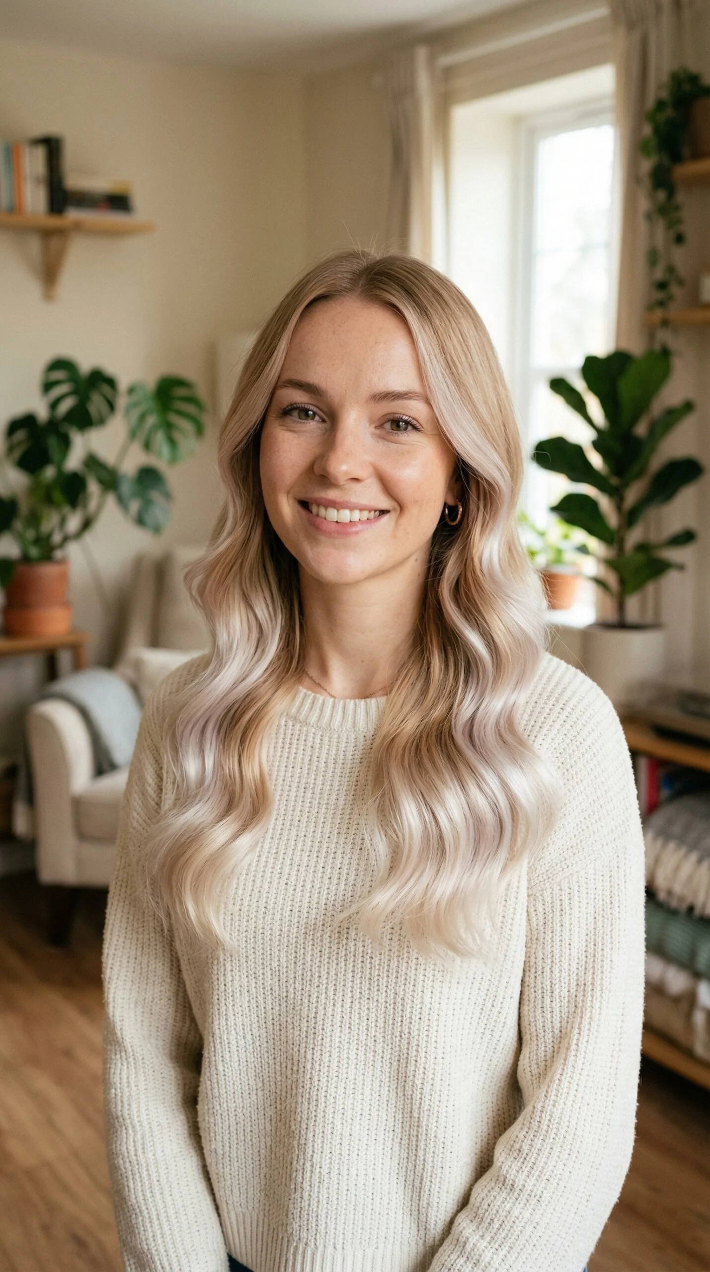 A darker root melts into beige blonde lengths seamlessly. The transition feels natural and modern.
