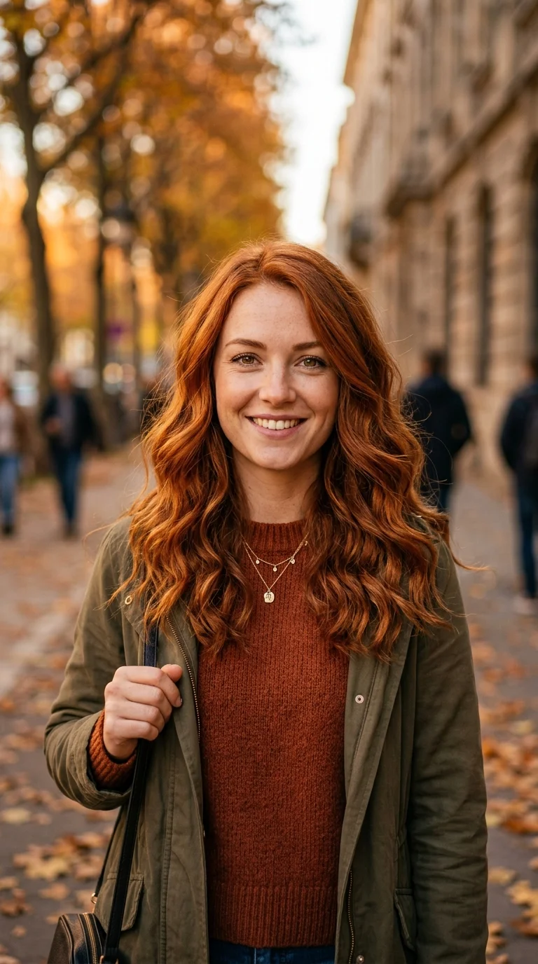 Copper highlights glow like sunset across the hair. The blend feels vibrant and alive.